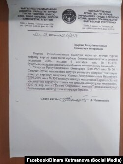 2012-жылдын 3-майында Айлана-чөйрөнү коргоо жана токой чарбасы мамлекеттик агенттигинин директору Сабир Атажанов «Центерра» менен келишимди изилдөө боюнча убактылуу депутаттык комиссиянын төрагасы Садыр Жапаровго кат жазып: «2009-жылкы өкмөттүн токтомуна ылайык «Кумтөр» алтын кениндеги иштерди көбөйтүү максатында мамлекеттик коруктун аймагынан «Кумтөр Оперейтинг Компанинин» керектөөсүнө 4380 гектар жер ажыратылды» деп билдирген.